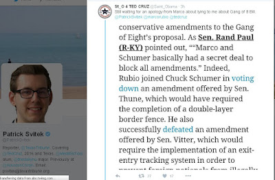 Here is an example, in Ted Cruz pointing out that Marco Rubio is a backstabbing liar, joined at the hip with Chuck Schumer in destroying Republican protection of America from the brown hordes.